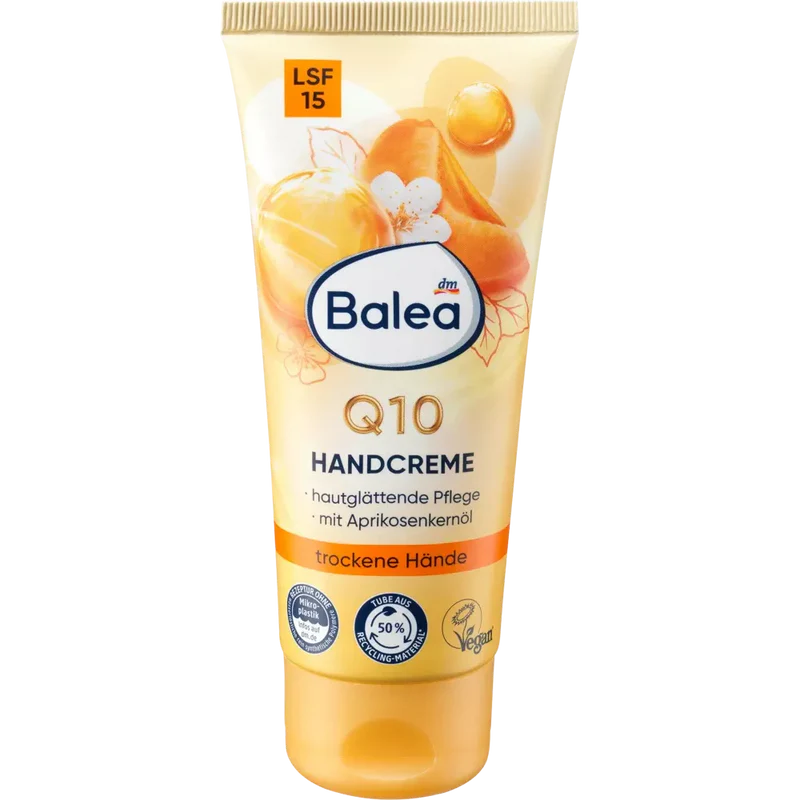 La crème mains Balea Q10 à l’huile de noyau d’abricot et SPF 15 est idéale pour les mains sèches. Ce soin protecteur intensif lisse la peau et la rend visiblement plus souple, tandis que son SPF 15 la protège des rayons UVA et UVB. Formulé sans microplastiques ni polymères hydrosolubles 100 % synthétiques.