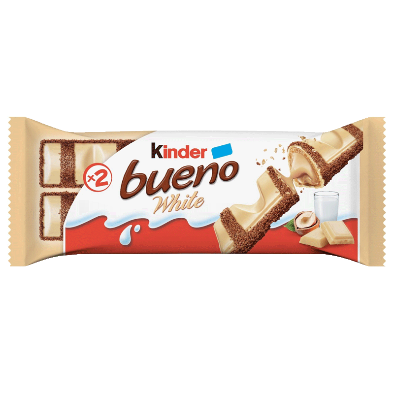 Kinder Bueno Chocolat Blanc – Gaufrette croustillante, cœur fondant noisette, enrobage chocolat blanc. Le plaisir gourmand à chaque bouchée
