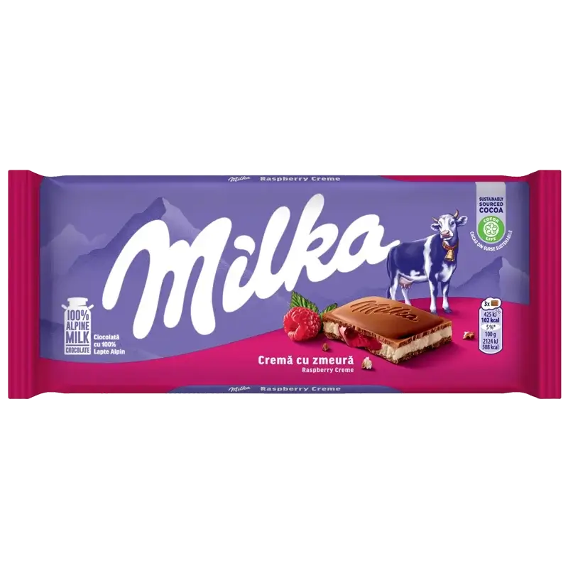laissez-vous tenter par l’irrésistible tablette Milka Framboise de 100g ! Ce chocolat au lait alpin fondant cache en son cœur une crème de framboise douce et acidulée, pour un duo de saveurs qui réveille les papilles en douceur.